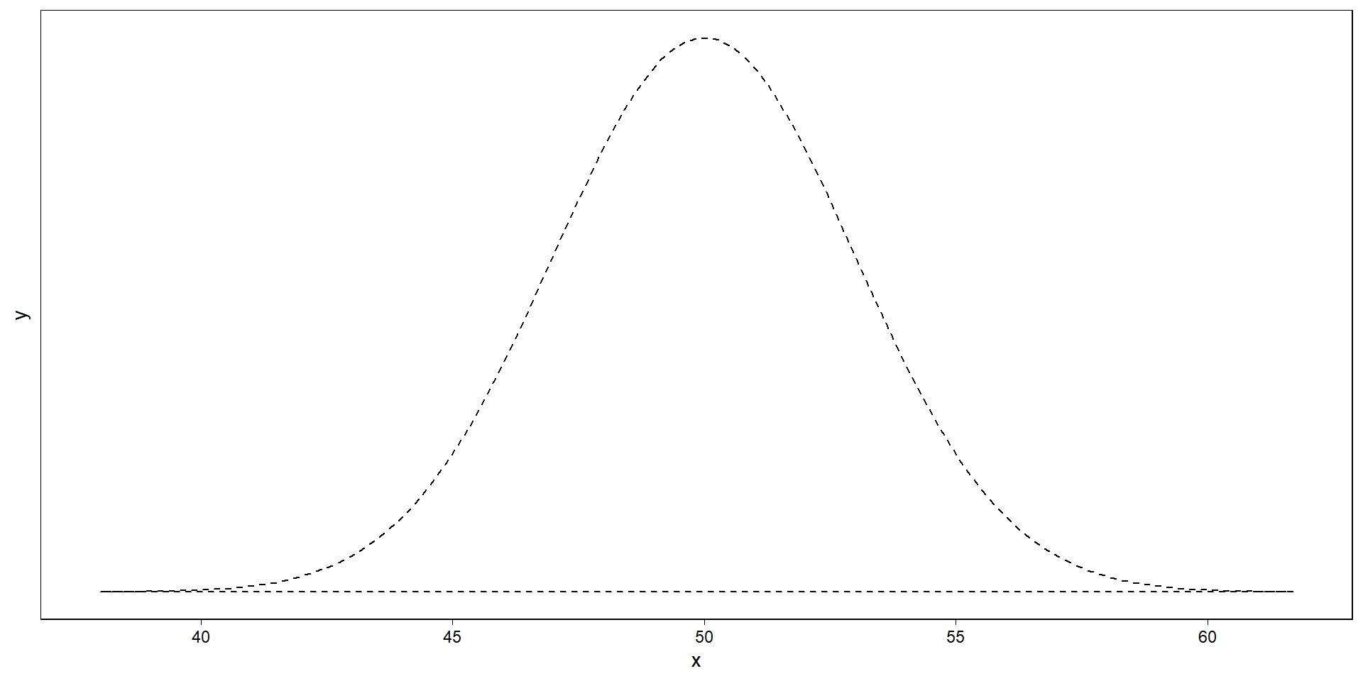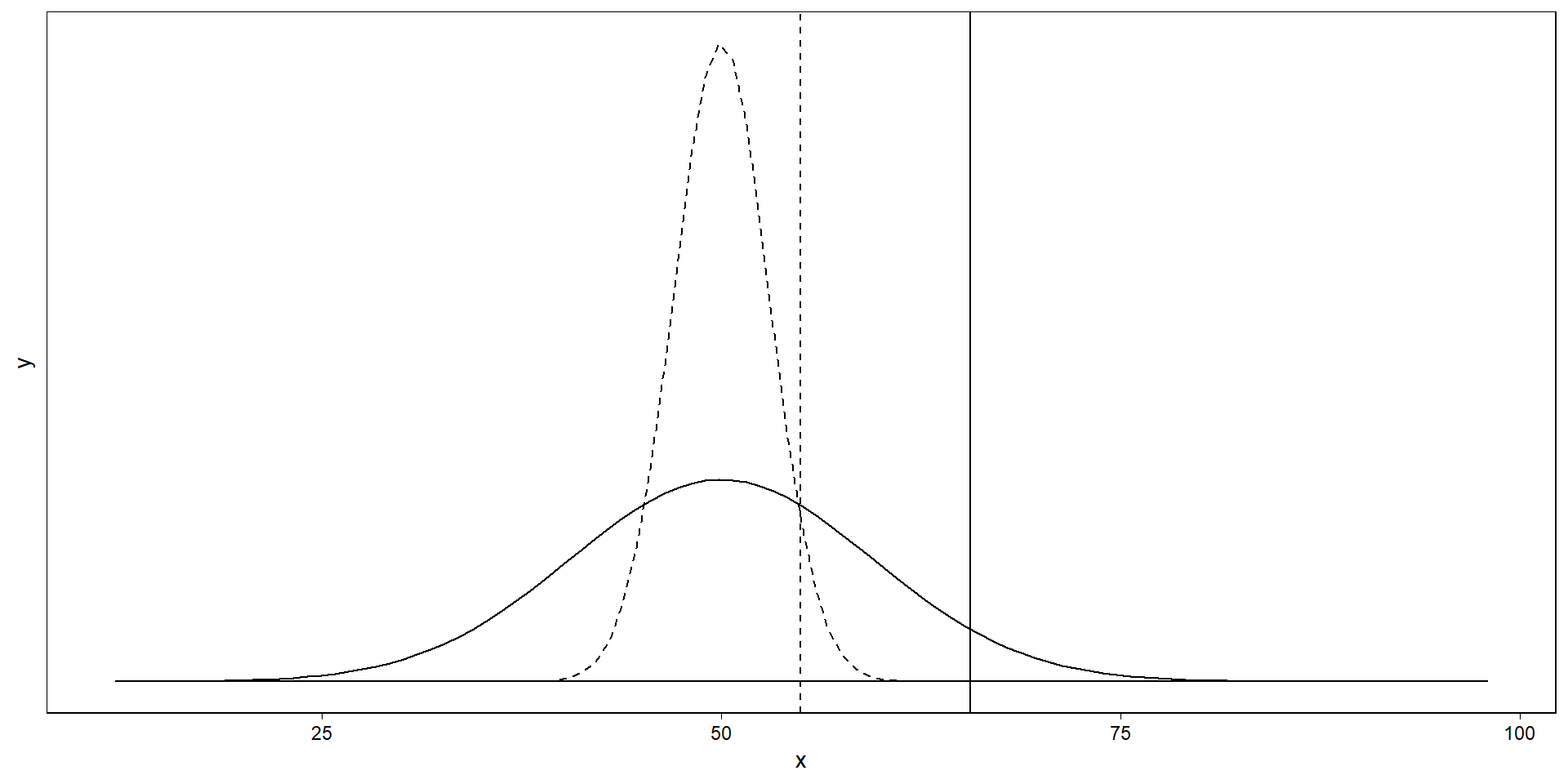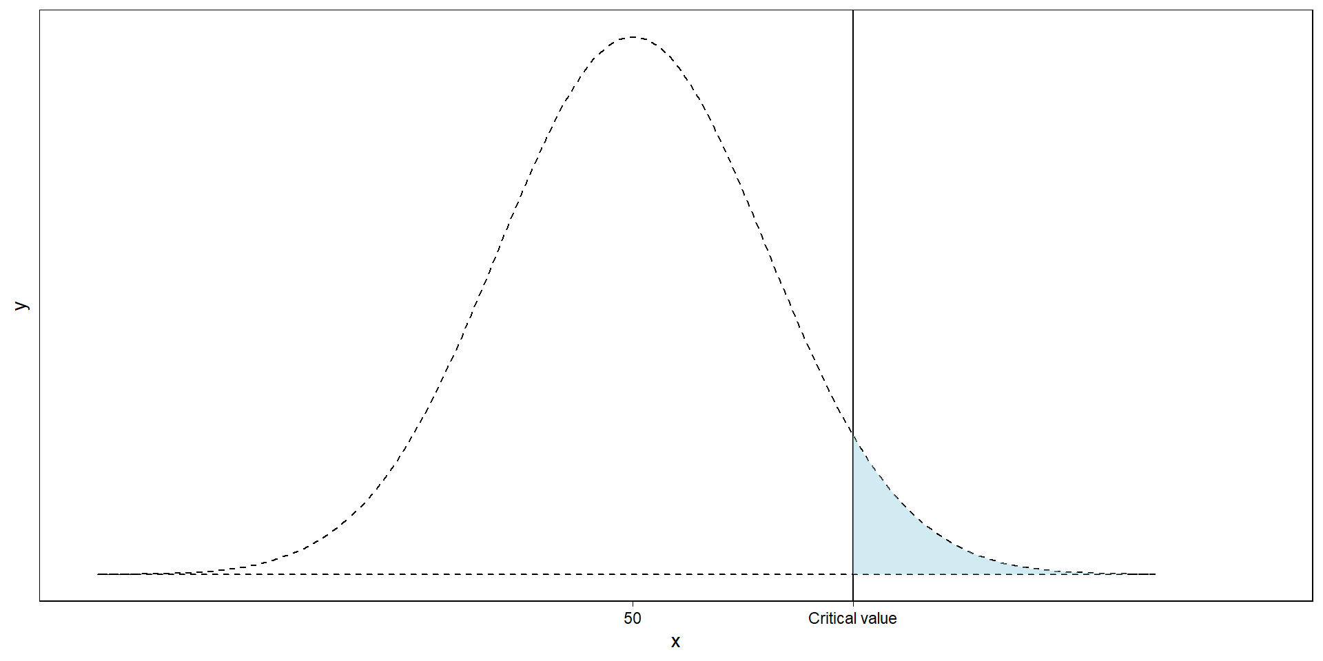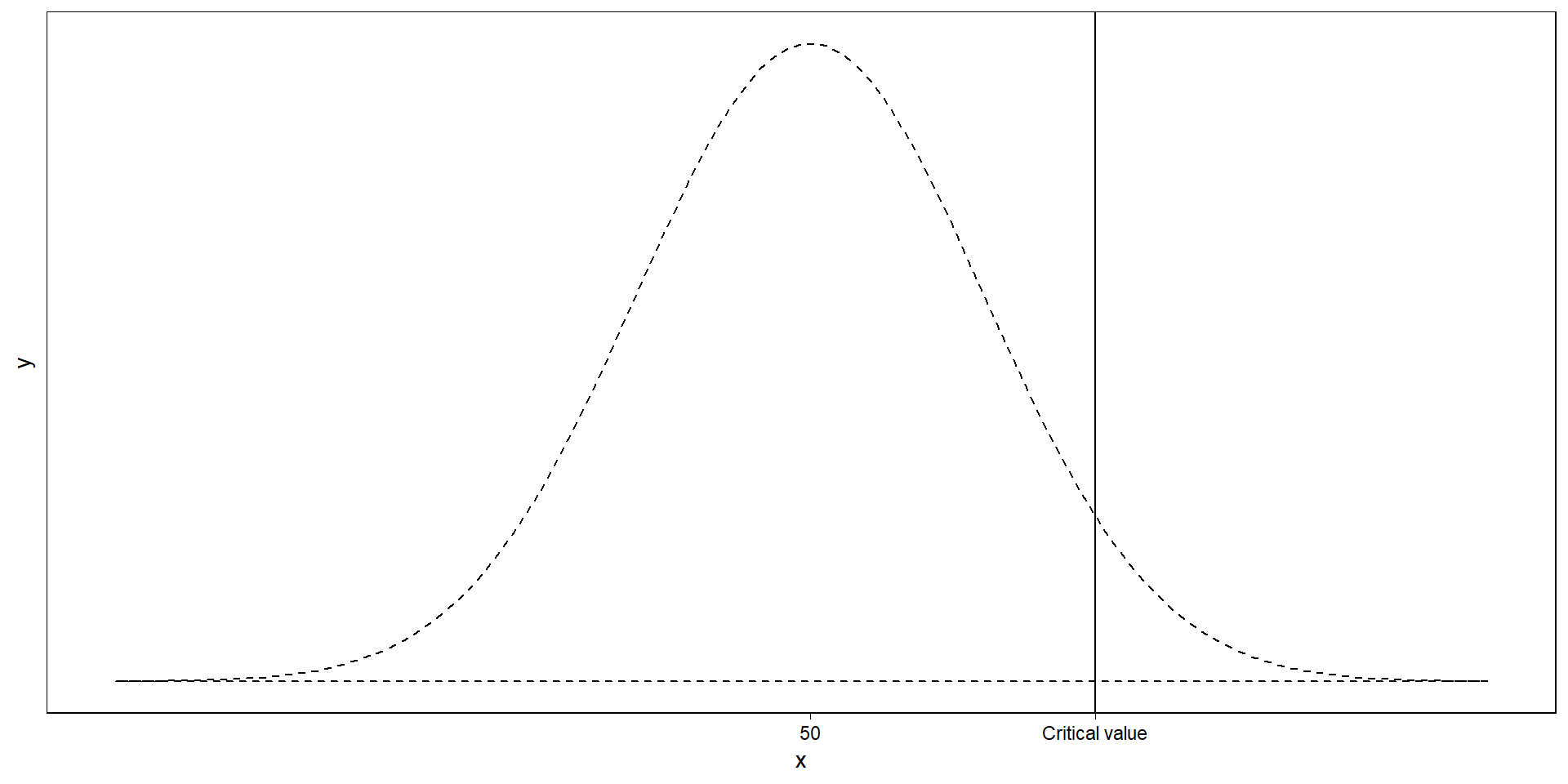 Let’s assume we want to know whether the population mean is larger than 50. We sample n = 100.