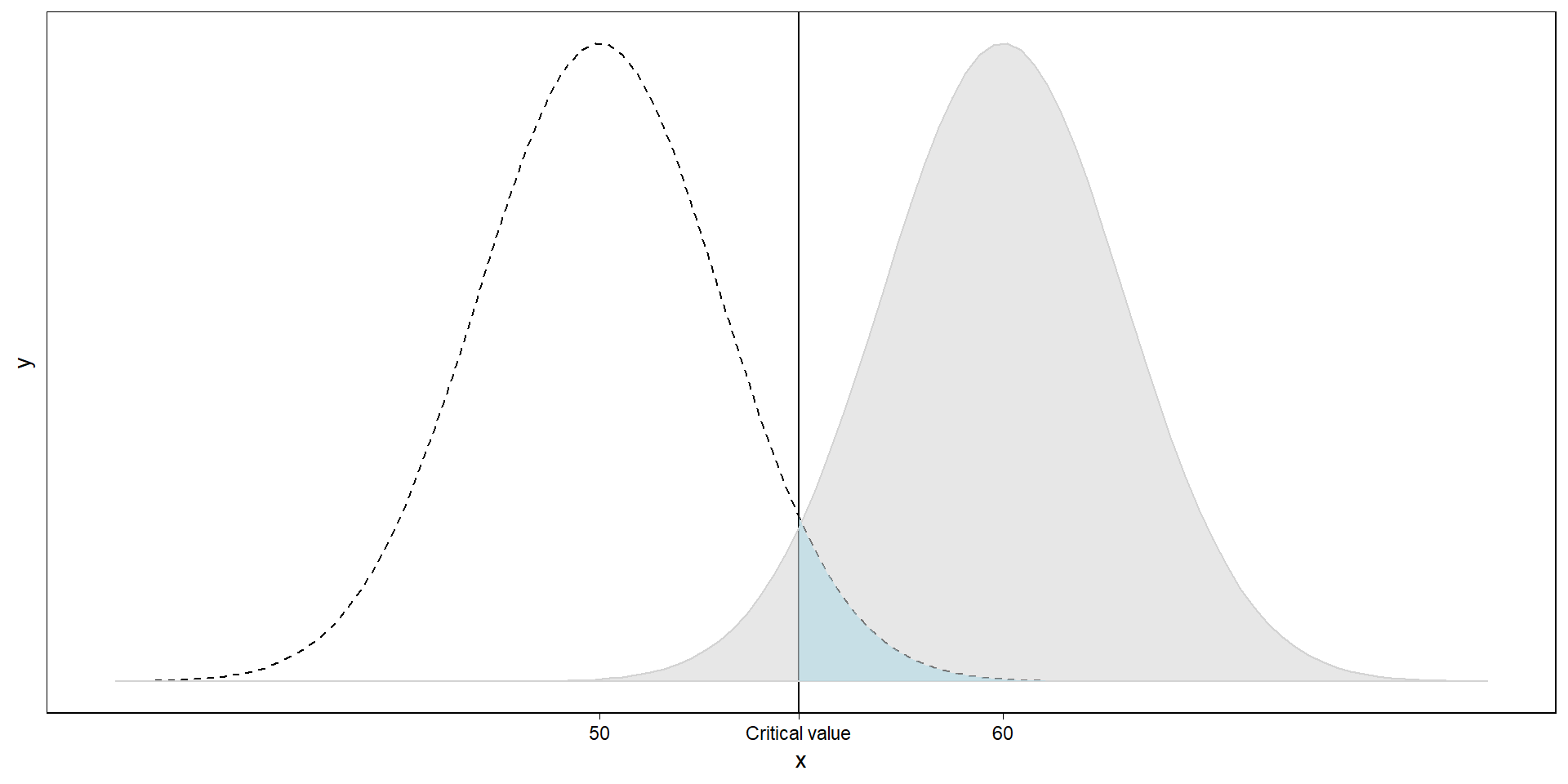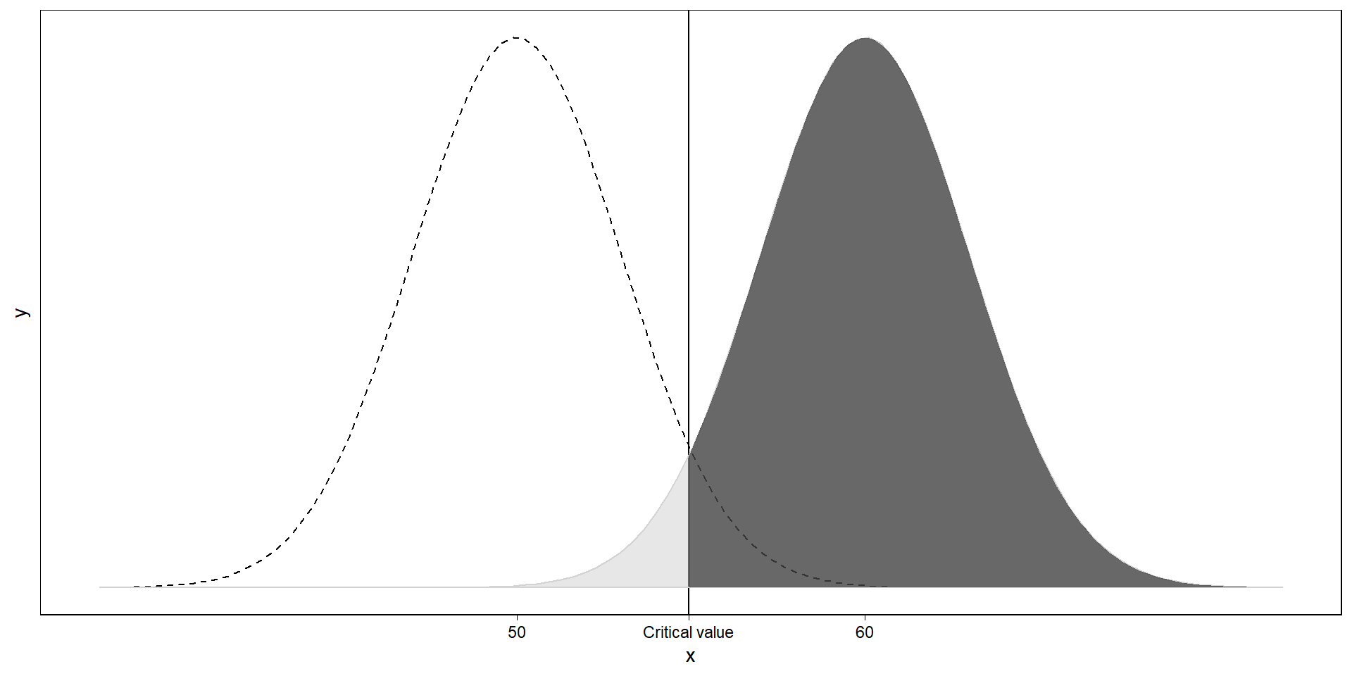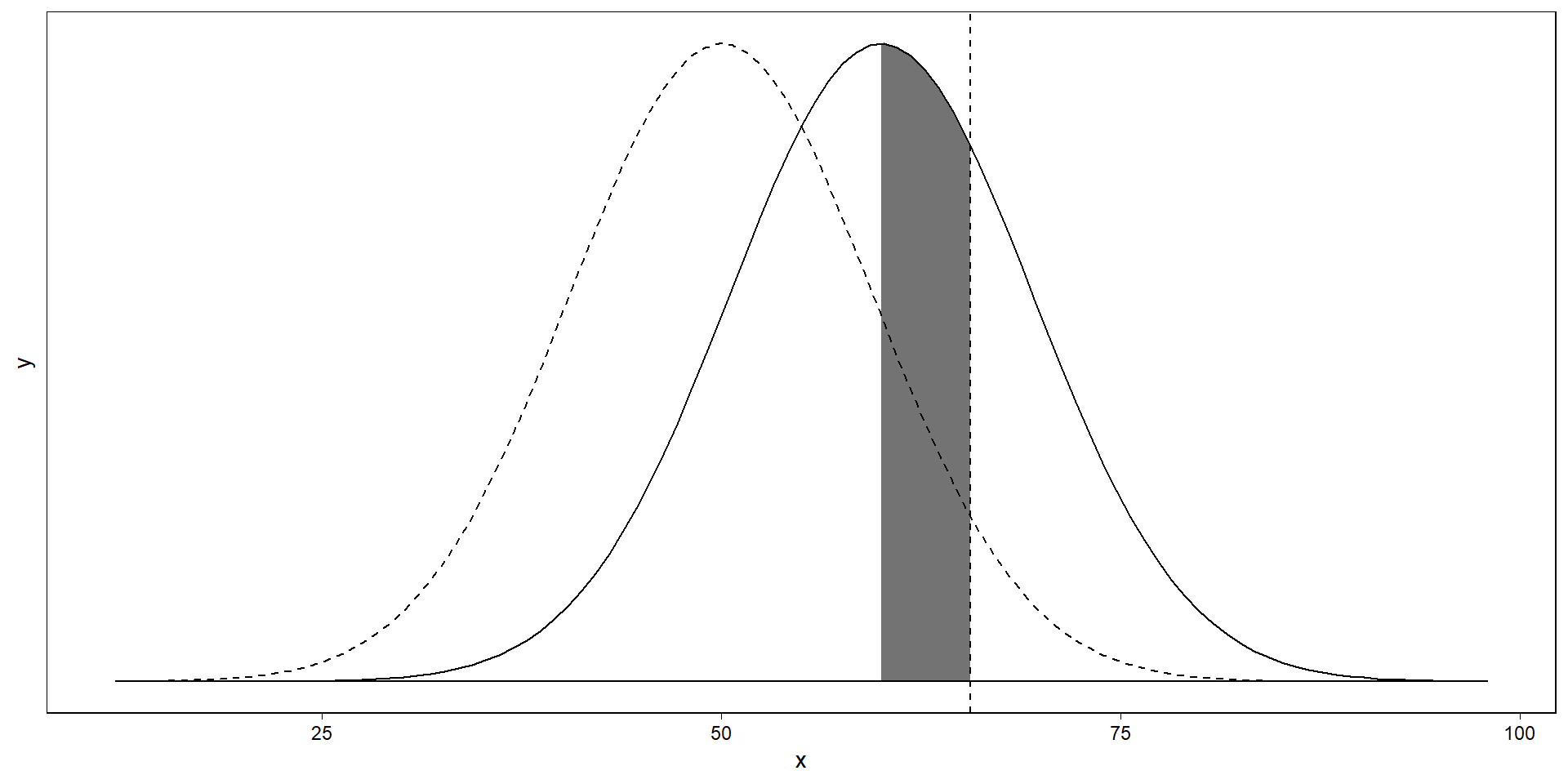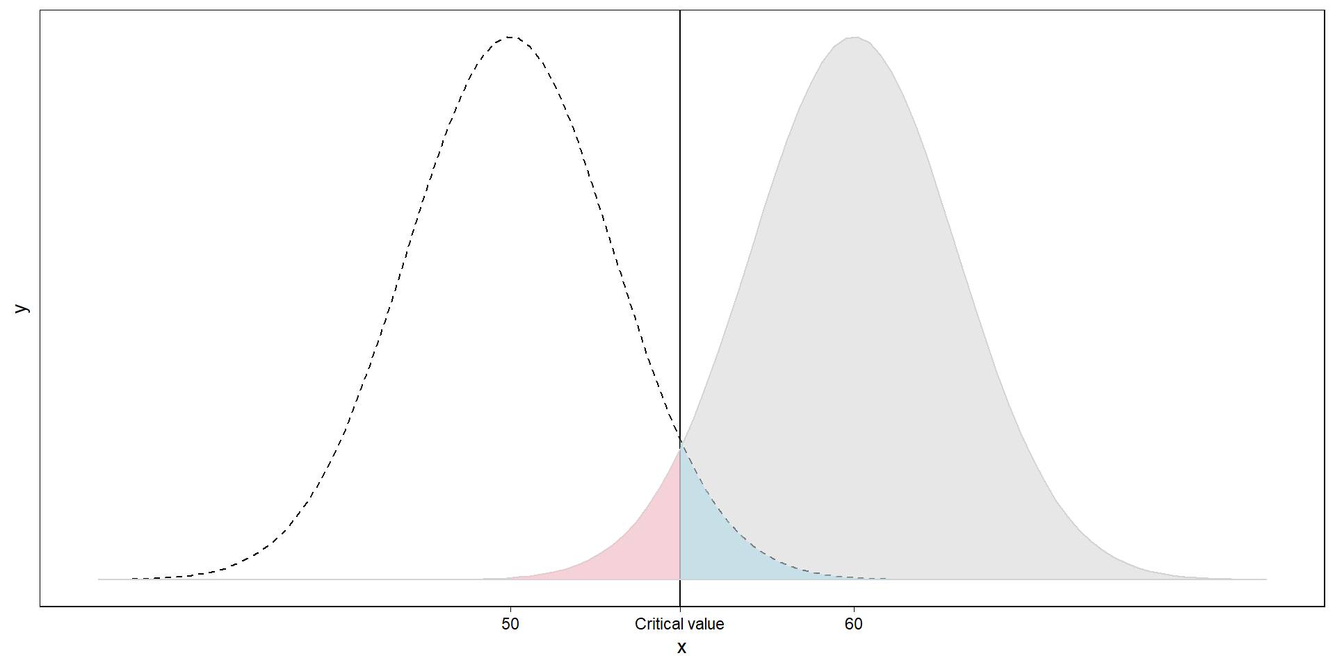 Our sampling distribution if the population value is 60. We commit a false positive if we assume a sample comes from the right distribution if in fact it comes from the left.